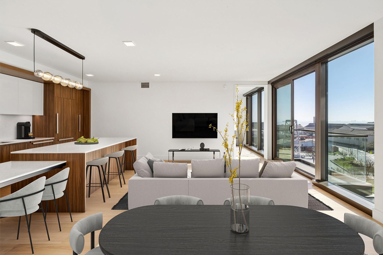 Discover our last remaining top-floor Penthouse offering breathtaking views of the Bay and Crane Cove Park from a private outdoor space. This home showcases contemporary design and premium finishes, top-of-the-line Miele appliances, white marble kitchen islands, and built-in wine refrigerators.